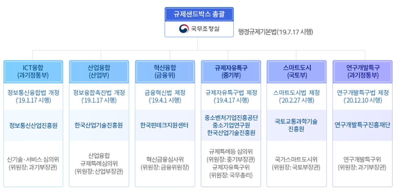 2017년 도입된 규제샌드박스제도는 신사업을 시도하는 기업들의 리스크를 최소화하기 위해 안전하게 시도해보고 큰 피해없이 성과를 확인할 수 있도록 지원하는 제도이다. 이 제도는 크게 3가지로 나뉜다. 규제가 있는지 여부를 확인하는 '신속 확인'과 규제의 적용을 유예하고 실증 테스트를 허용하는 '실증특례', 정식으로 허가하기 전에 시장에 신속하게 출시하도록 허가하는 '임시허가'가 있다.