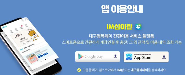 행복페이 간편이용 서비스 앱인 "IM샵"을 설치하면 충전뿐 아니라 카드 잔액 확인, 이용 내역 조회 등 손안에서 행복페이의 모든 것을 확인하고 관리할 수 있어요. 구글플레이나 앱스토어에서 "IM샵"이나 "대구행복페이"로 검색하세요.