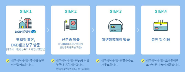 행복페이를 발급받으시려면 대구은행 영업점이나 DGB셀프창구를 방문하시면 됩니다. 신분증이 꼭 필요하구요. 셀프창구로 가실 경우는 본인명의의 핸드폰을 함께 갖고 가셔야해요. 그리고 대구행복페이는 대구시민이 아니어도 발급이 가능해요. 대구 여행 오시거나 쇼핑 오시는 분들도 사용하시면 좋겠네요.(14세 이상, 셀프창구는 19세 이상 가능)