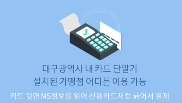 대구시내 카드 단말기가 설치된 모든 가맹점에서 사용 가능할 수 있답니다. 음식점, 학원, 주유소, 문구점, 편의점, 병원, 미용실, 안경점, 헬스.레저시설 등 수많은 가맹점들이 있답니다.