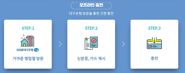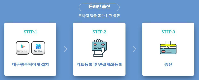 하지만 번거롭게 은행에 직접 가지 않아도 온라인 충전이 가능해요. 대구행복페이 앱을 설치하고 본인의 카드를 등록한 다음 대구은행 계좌를 연결해서 바로 충전하실 수 있어요. 너무 편리하죠~