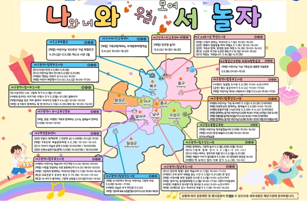 그렇다면, 그동안 코로나19로 움츠렸던 우리 어린이들이 드디어 야외마스크 규제도 풀리는 이번 어린이날과 가정의 달에 맘껏 즐길 수 있는 곳은 어디일까? 대구에서도 여러 행사들이 열린다고 하는데 무료로 또는 저렴한 비용으로 이용할 수 있는 공공기관의 이벤트 소식을 공유해보려고 한다.