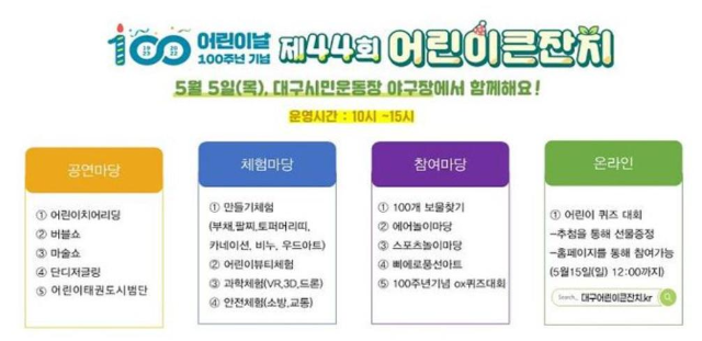 대구시와 대구시 교육청이 주최하고 매일신문사가 주관하는 어린이날 100주년 기념행사 '어린이 큰잔치' 가 5월 5일 오전 10시부터 오후3시까지 대구시민운동장 야구장(DGB대구은행파크)에서 열린다. 지난 2년동안 코로나19의 영향으로 어린이날 행사를 열지 못했으나 사회적 거리두기의 규제가 풀리고 야외 활동이 가능해진 덕분에 어린이날 100주년이 되는 올해는 다행히 기념식과 더불어 다양한 행사가 열린다. 이 행사에는 시민 누구나 사전 신청 없이 모든 프로그램을 무료로 참여할 수 있다.