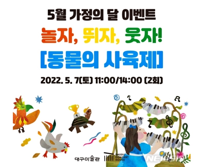 대구미술관과 대구콘서트하우스와 공동 주최하는 클래식 연주회 ‘동물사육제’는 7일 오전 11시, 오후 2시 두 차례 열리며 사전예약 오픈 7분 만에 400석이 매진되었다고 한다. 이 연주회에서는 생상스의 '동물의 사육제'를 10인조 오케스트라가 전곡 연주하고, 어린이들이 좋아할 연극도 선보인다고 하니 아이들과 클래식을 즐기고 싶은 부모님들이 뜨거운 열기로 이미 전석을 선점했다고 한다.
