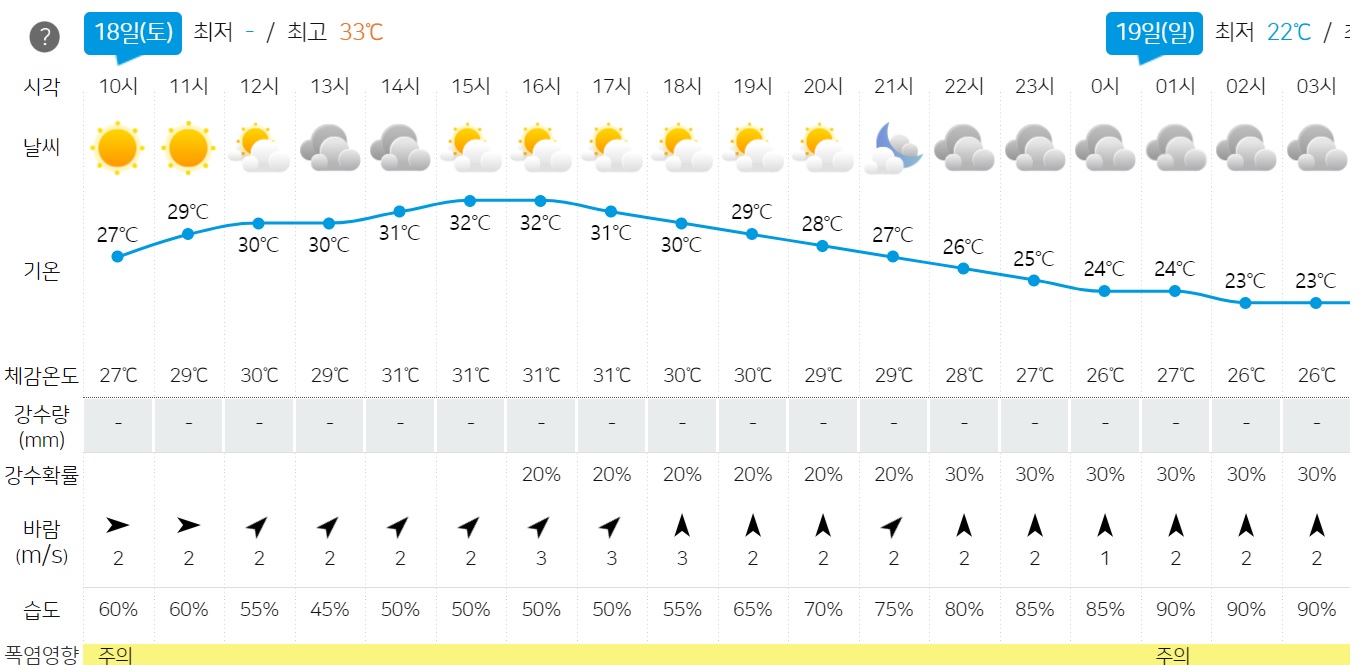 오후 3시경 정점을 찍어 오늘 최고기온은 32도까지 올라갈 모양이다. 그런데 시간대별 예보와 다르게 오늘 대구의 최고기온이 33도라고 표시되어있다. 이상하지만 이유를 모르겠다. 일요일인 내일도 오늘 날씨와 별반 다르지 않다.