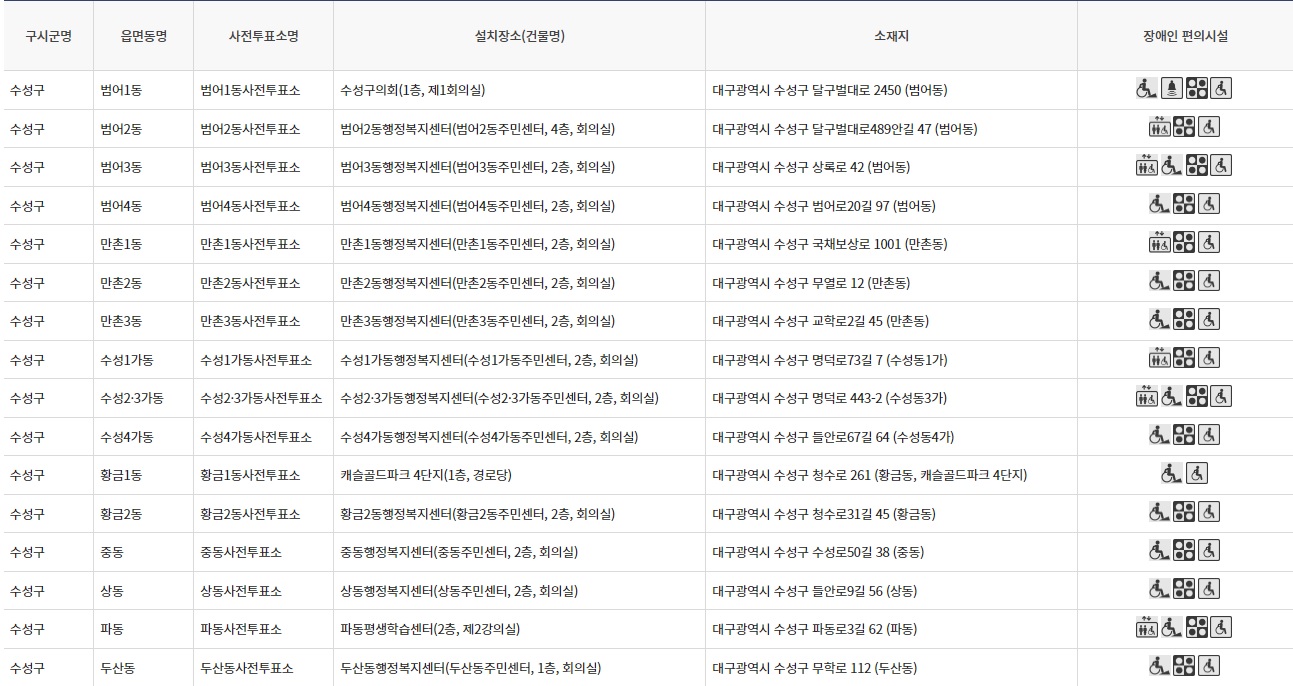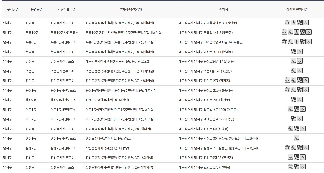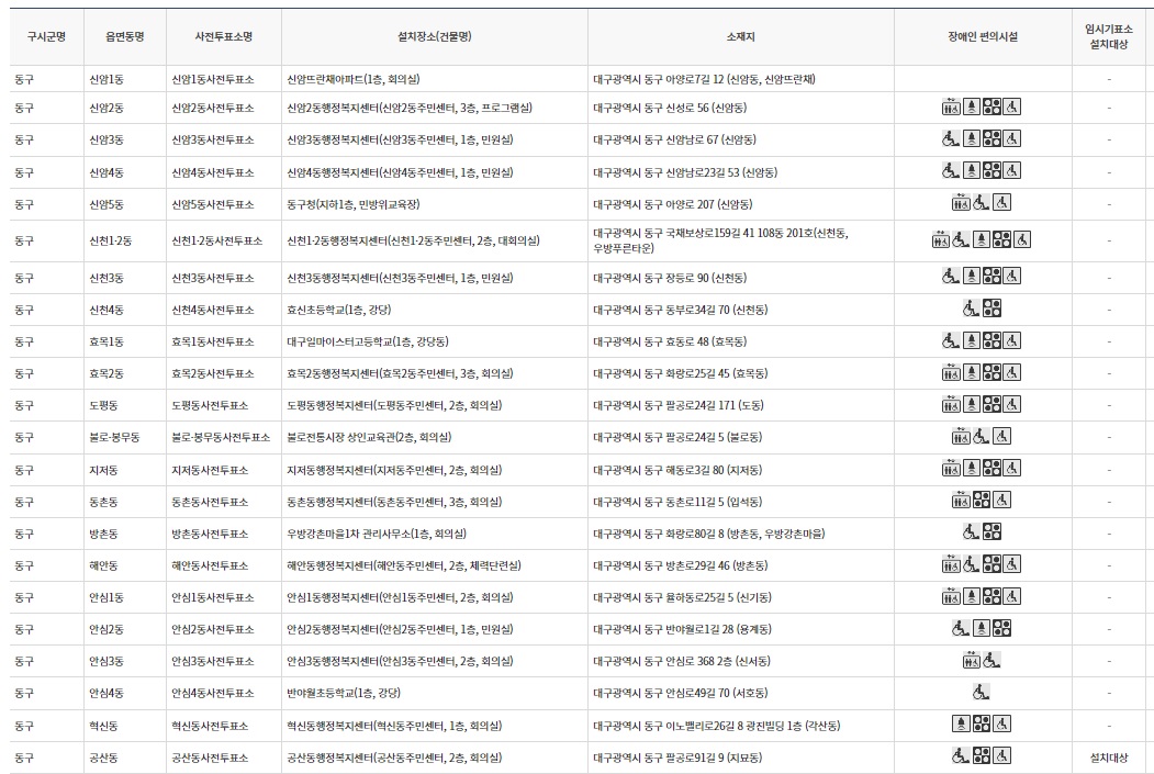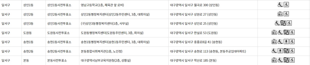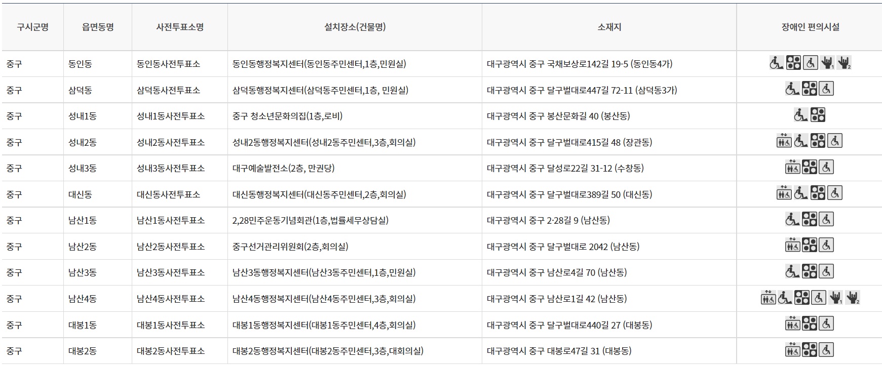 대구시의 사전투표소 현황은 아래와 같다.(모든 자료는 선관위 홈페이지의 내용을 캡처한 것임)