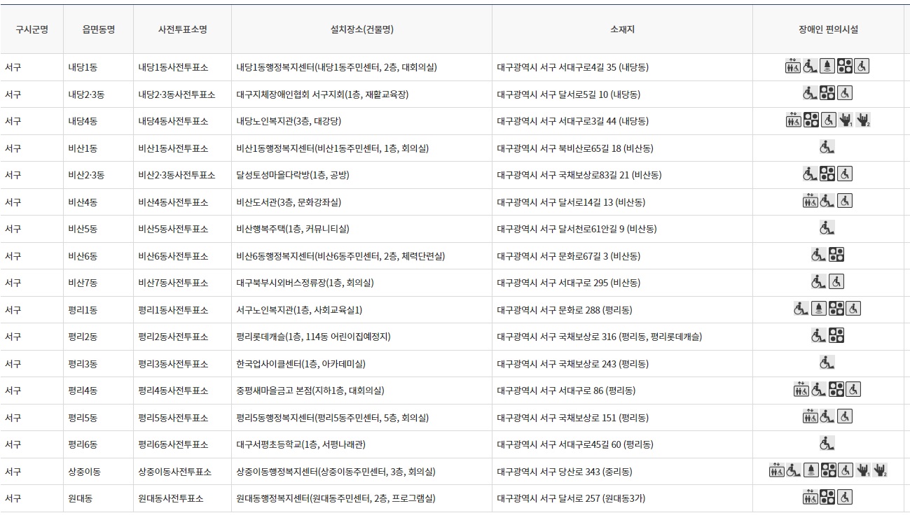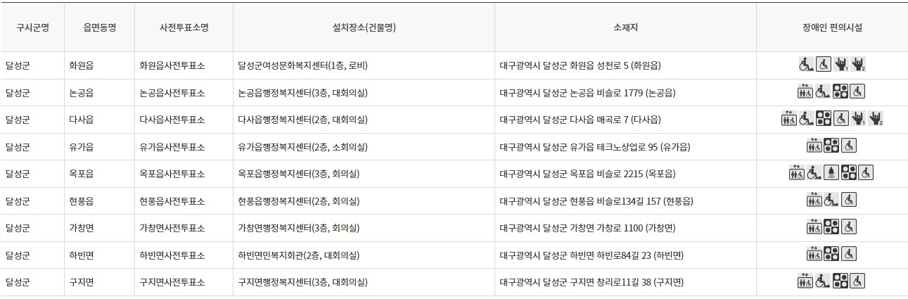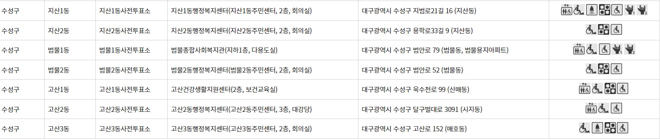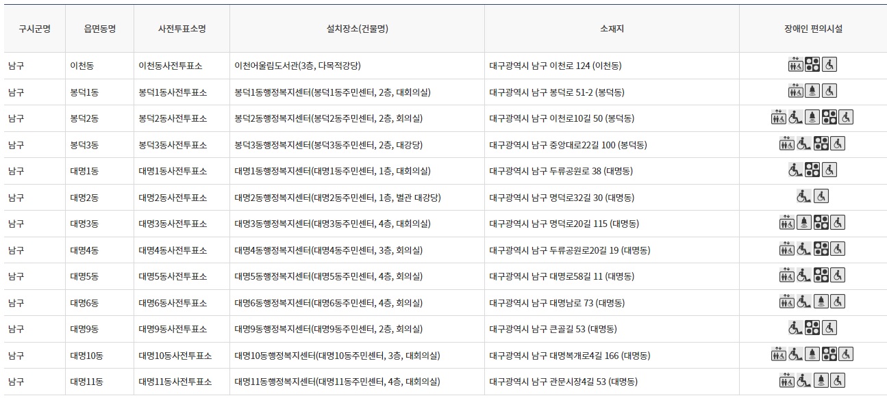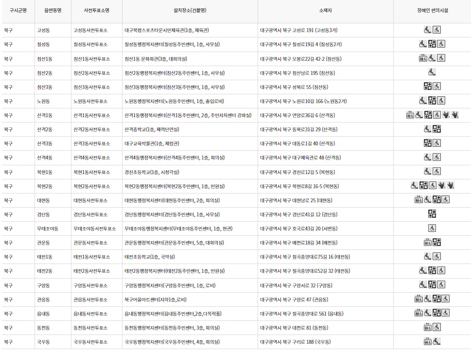 대구시의 사전투표소 현황은 아래와 같다.(모든 자료는 선관위 홈페이지의 내용을 캡처한 것임)