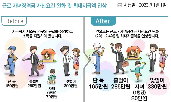 인상된 기준에 따르면 맞벌이기준 근로장려금은 최대 330만원이고