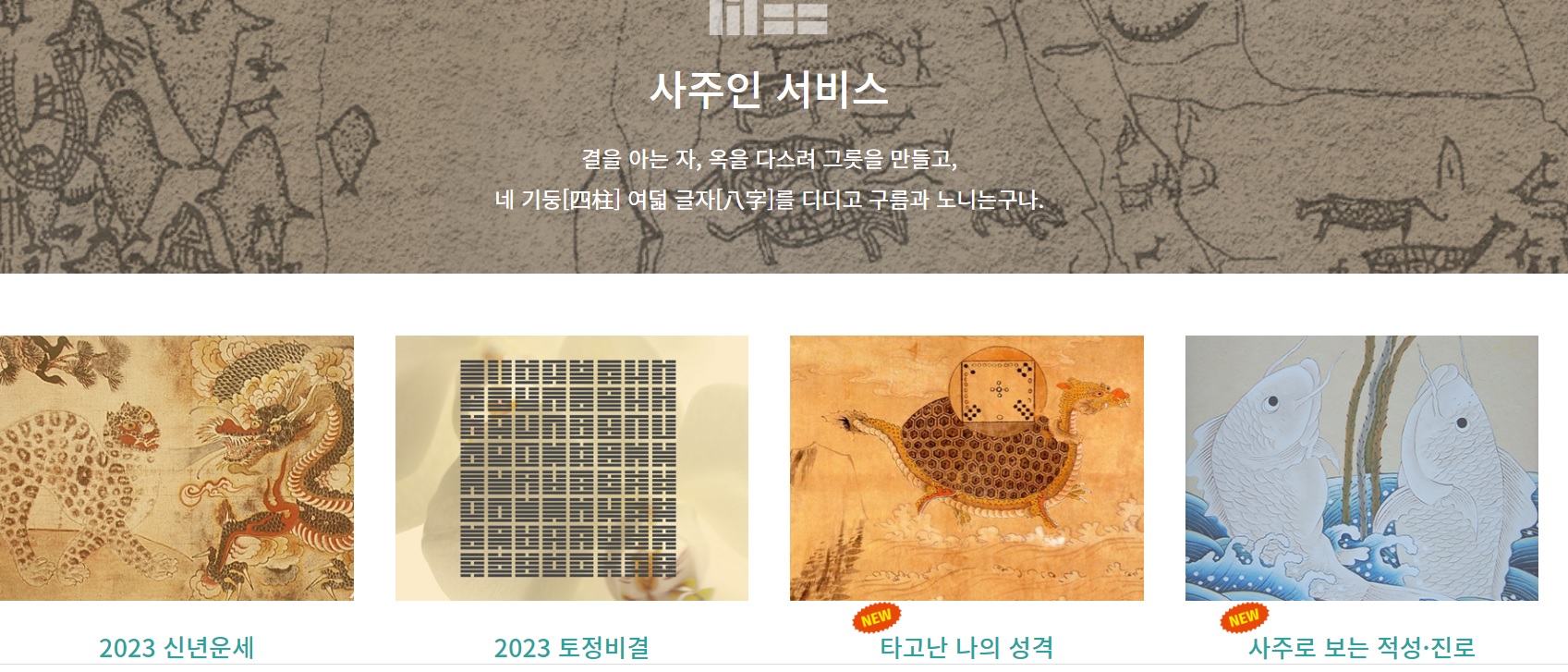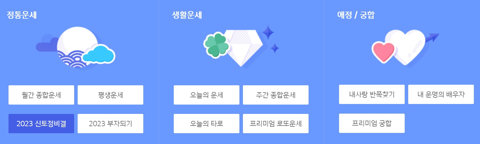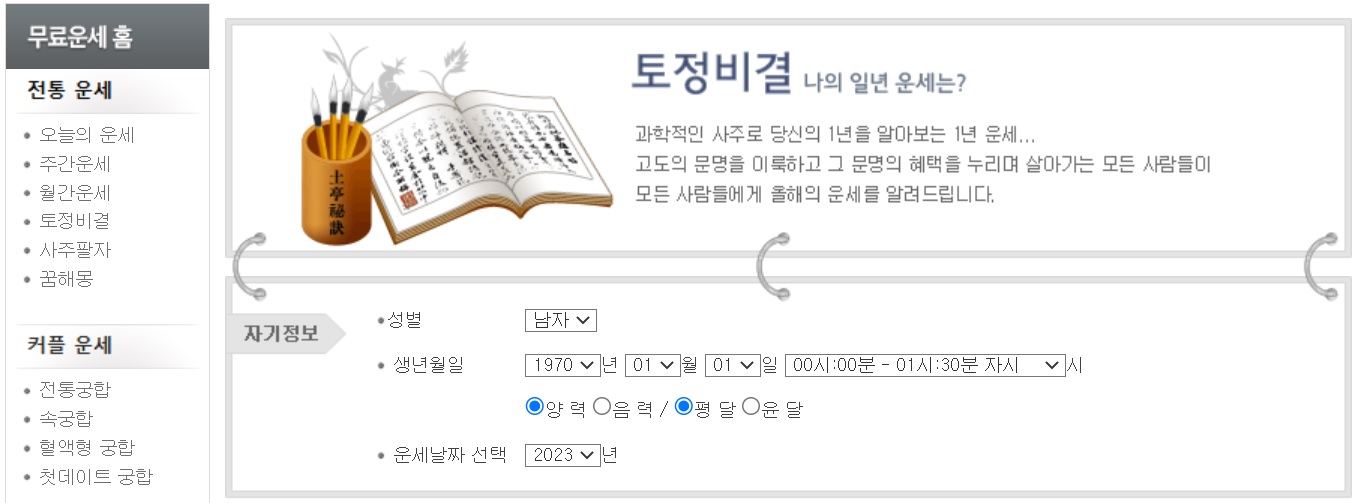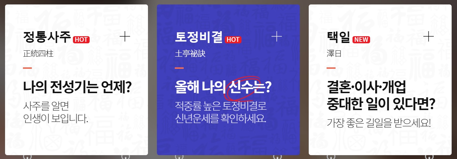 '토정비결, 사주, 궁합, 연애운, 오늘의 운세, 띠별 운세, 신년운세, 타로 등 운세 서비스 무료 제공