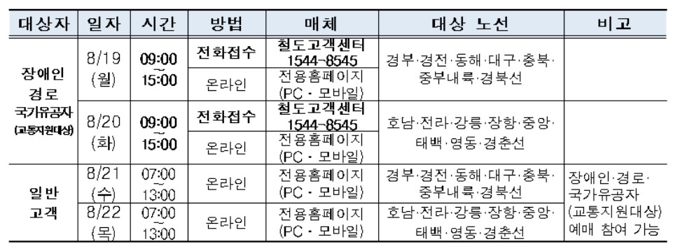 예매기간이 끝난 후 미판매된 잔여석은 8.22.(목) 15:00부터 역 창구, 홈페이지, 코레일 톡에서 상시 구입하실 수 있습니다.